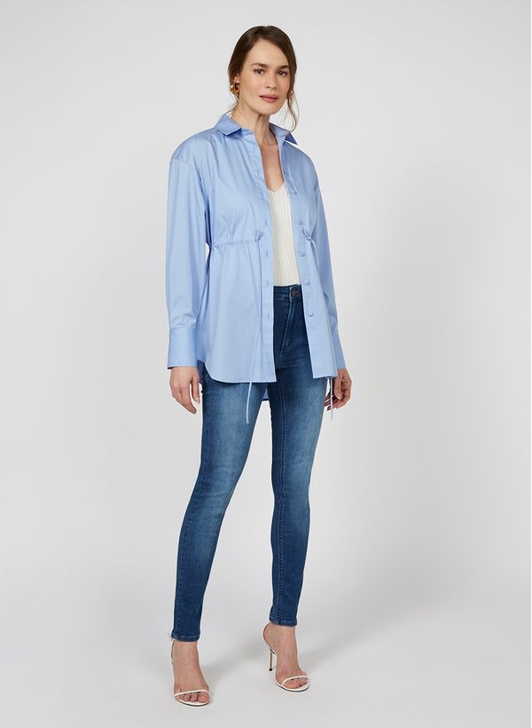 Confeccionada em tecido plano, a Chemisa possui modelo parka, detalhe franzido na cintura com cordão para amarração, fechamento frontal com botões, mangas longas com abotoamento nos punhos, barra arredondada e acabamento pespontado.