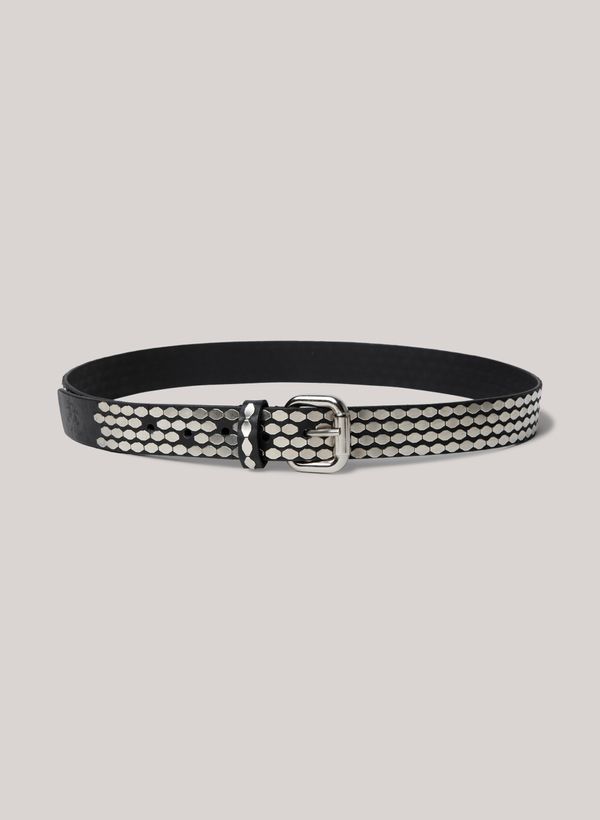 Produzido em couro, o Cinto possui fivela de metal, detalhes metálicos aplicados em toda a sua extensão e expessura média.