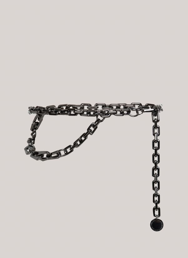 Confeccionado em metal, o Cinto é formado por elos, fechamento por mosquetão e assinatura da marca em plaquinha redonda na extremidade.
