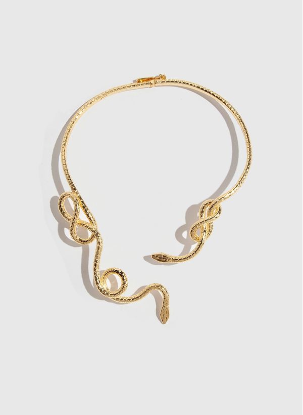 O Colar é fabricado em latão com banho dourado, possui formato de cobra com detalhes texturizados e fechamento posterior.