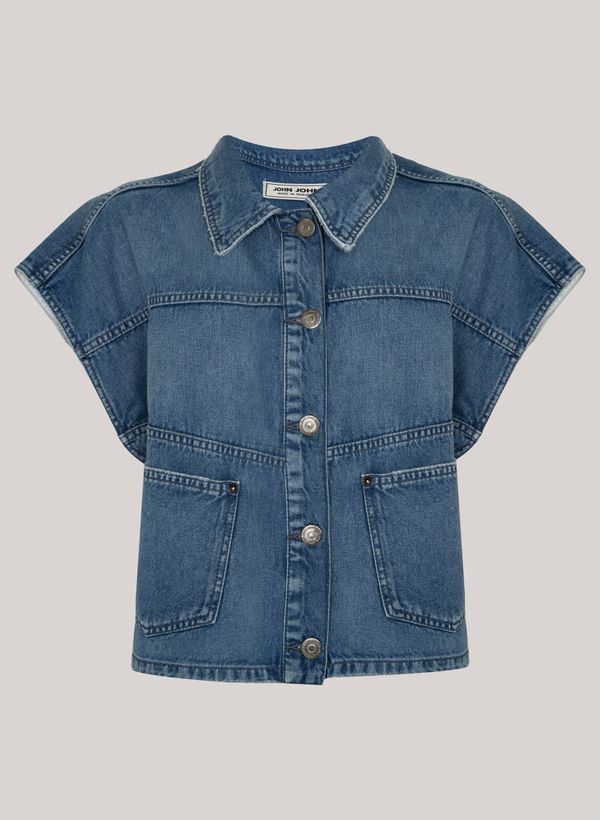 Confeccionado em jeans, o Colete possui modelagem ampla, gola clássica, vista com botões, ombros largos, bolsos frontais com plaquinha metalizada personalizada e acabamento pespontado.
