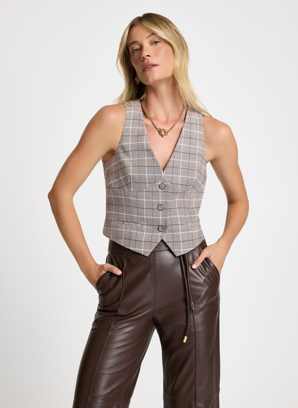 Colete é confeccionado em tecido plano, possui padronagem xadrez, modelagem de alfaiataria, decote em "V", alça média, fechamento frontal por botões, dois bolsos embutidos, martingale com mini fivela posterior e acabamento pespontado.
