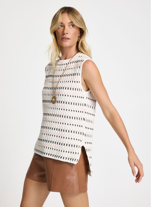 O Colete é confeccionado em tricot alto-relevo em cores bicolor, possui caimento reto, gola redonda, alças largas, fendas laterais e acabamento pespontado.