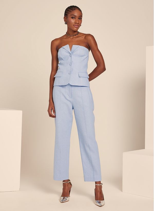O Colete é confeccionado em tecido plano com toque de linho, possui modelagem em alfaiataria,decote em “V com lapelas dobradas, fechamento frontal por botões, bolsos decorativos frontais e acabamento pespontado.