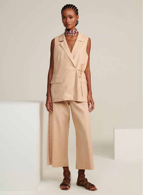 Colete é confeccionado em linho, possui modelagem em alfaiataria, decote V, lapelas notched, alças largas, fechamento frontal por amarração, bolsos decorativos frontais, pences posteriores e acabamento pespontado.