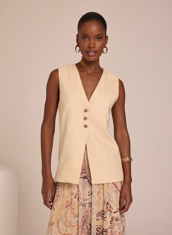 O Colete é confeccionada em linho, possui modelagem de alfaiataria, caimento reto, decote em "V", alças largas, fechamento frontal por abotoamento triplo, fenda frontal e acabamento pespontado.