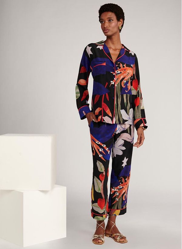 O Conjunto é confeccionado em seda com padronagem e possui modelagem reta. A Blusa possui colarinho, decote em V, fechamento frontal por botões revestidos, bolso frontal, mangas longas e acabamento pespontado. A Calça possui cós com elástico posterior, bolsos frontais, barra cropped e acabamento pespontado.