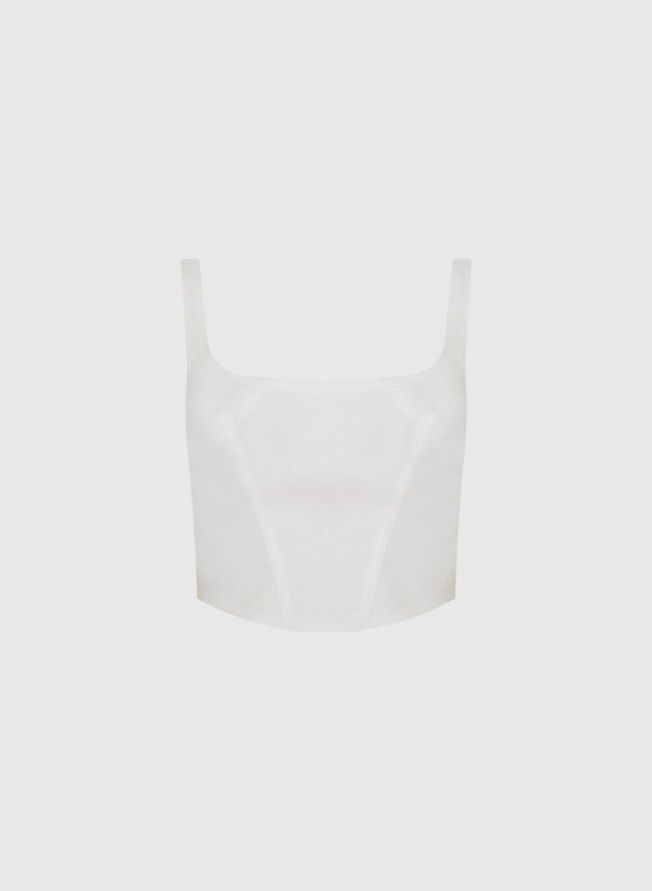 O Corset é confeccionado em linho, possui caimento ajustado ao corpo, decote reto, alças médias, fechamento posterior por zíper e acabamento pespontado.