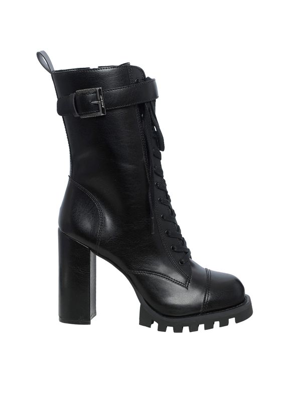 A Bota é confeccionada em material sintético, possui cano alto, fechamento por cadarço com pala sobreposta, aplicações de faixas laterais com fechamento por fivelas metálicas, salto alto no modelo bloco, sola tratorada e acabamento pespontado.