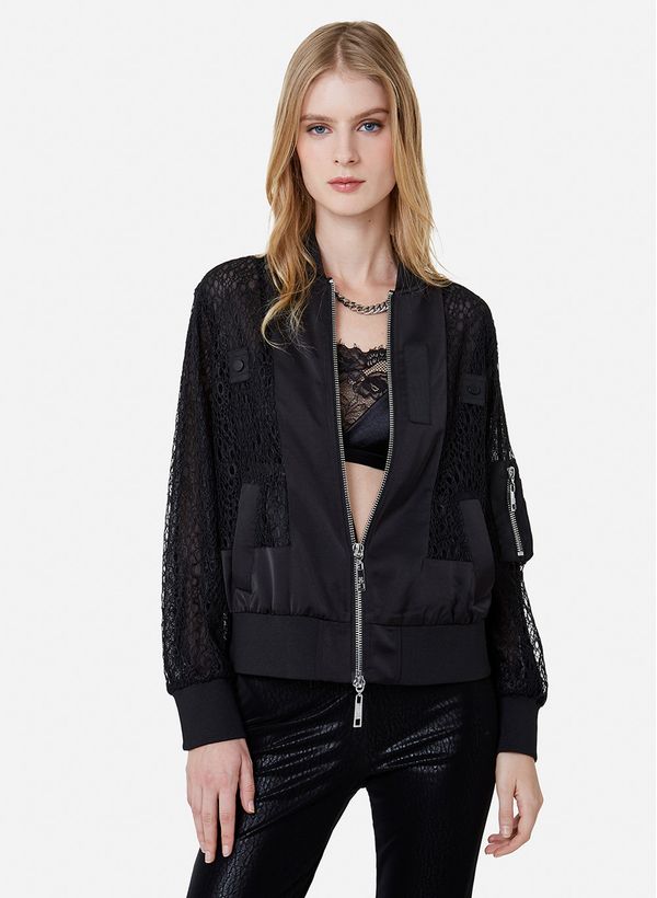 Confeccionada com detalhes em renda, a Jaqueta possui modelagem tipo Bomber Ellie, bolsos frontais, bolso na manga, aviamentos em níquel e fechamento por zíper de metal personalizado.