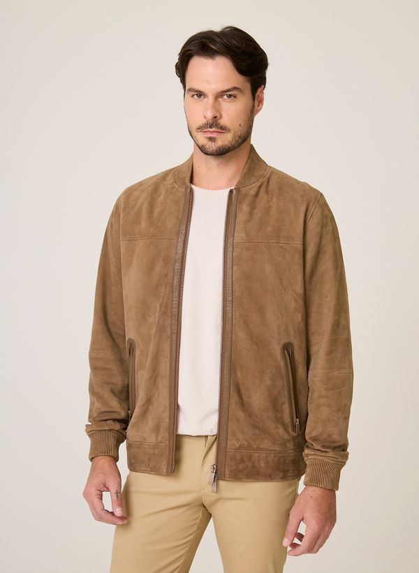 Confeccionada em couro tipo camurça, macio e aveludado, a Jaqueta possui modelagem Clássica, mangas longas, gola e punhos canelados, dois bolsos frontais, forro interno e fechamento frontal por zíper duplo.