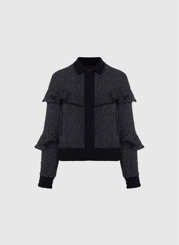 Confeccionada em malha com fios de lurex, a Jaqueta possui colarinho, detalhe frontal por zíper e botão, mangas longas, babados, dois bolsos, forro interno e acabamento com elástico.