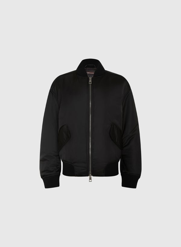 A Jaqueta é confeccionada em nylon acetinado, possui modelagem alfaiataria, modelo bomber, gola semi alta, mangas longas, dois bolsos frontais com fechamento por botão de pressão, forro interno, fechamento frontal por zíper, barra aplicada e acabamento canelado
