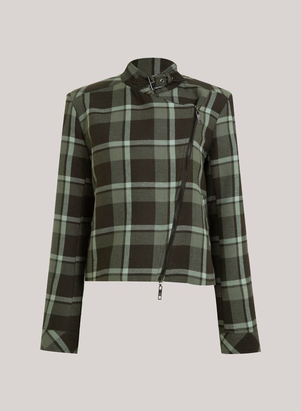 Confeccionada em tecido plano com padronagem xadrez, a Jaqueta possui modelagem reta, gola alta com cinto aplicado, mangas longas com abotoamento nos punhos, fechamento frontal por zíper plaquinha metalizada personalizada e acabamento pespontado.