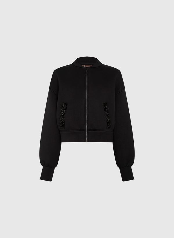 A Jaqueta é confeccionada em malha, possui caimento reto, decote redondo, mangas longas, dois bolsos aplicados com detalhes em bordado, fechamento frontal por zíper e acabamento pespontado.