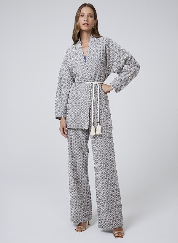 Uma peça super versátil e prática, que irá deixar seu look mais cool e comfy. Aposte no Kimono bordado para criar um conjunto com a calça da mesma coleção. Invista em acessórios delicados para finalizar o look.