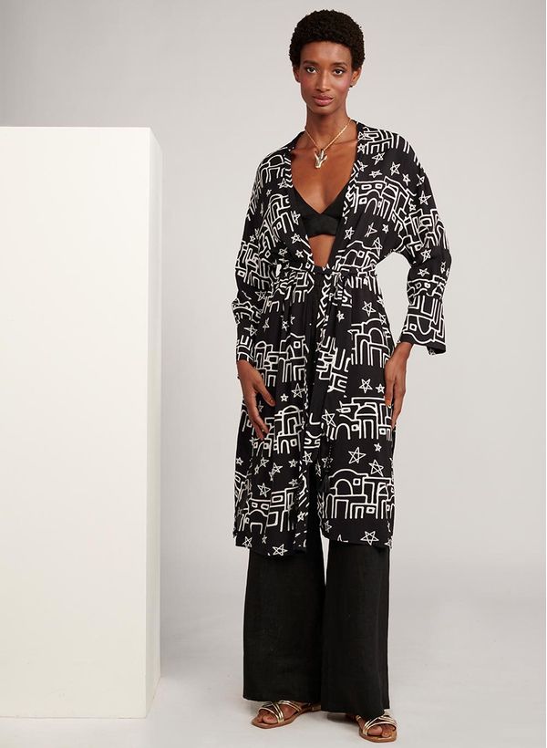 O Kimono é confeccionado em tecido fluido estampado, possui modelagem reta, fechamento frontal por faixa proporcionando um caimento acinturado, mangas longas, comprimento midi e acabamento pespontado.