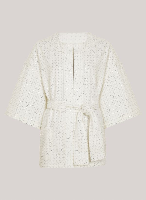 sarja com aplicação de paetês, o Kimono possui modelagem
