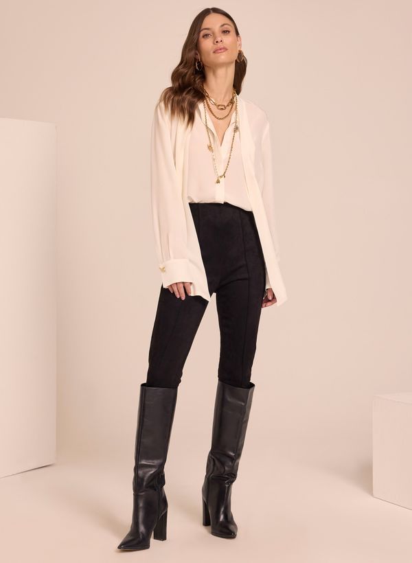 A Calça é confeccionada em tecido sintético, possui modelagem skinny, cós alto e acabamento pespontado.