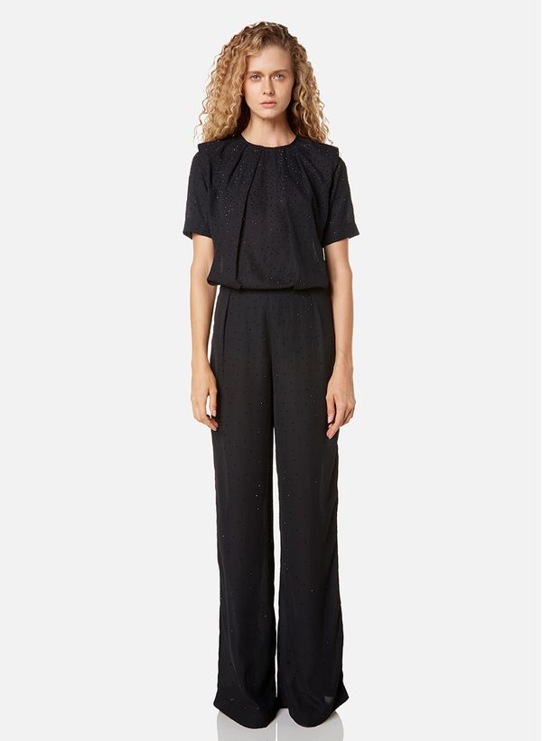 Confeccionado em tecido plano, o Macacão possui modelagem ampla tipo pantalona, manga curta com ombreiras, detalhe de pregueado frontal, aplicação de hotfix decrescente e fechamento por zíper invisível posterior.