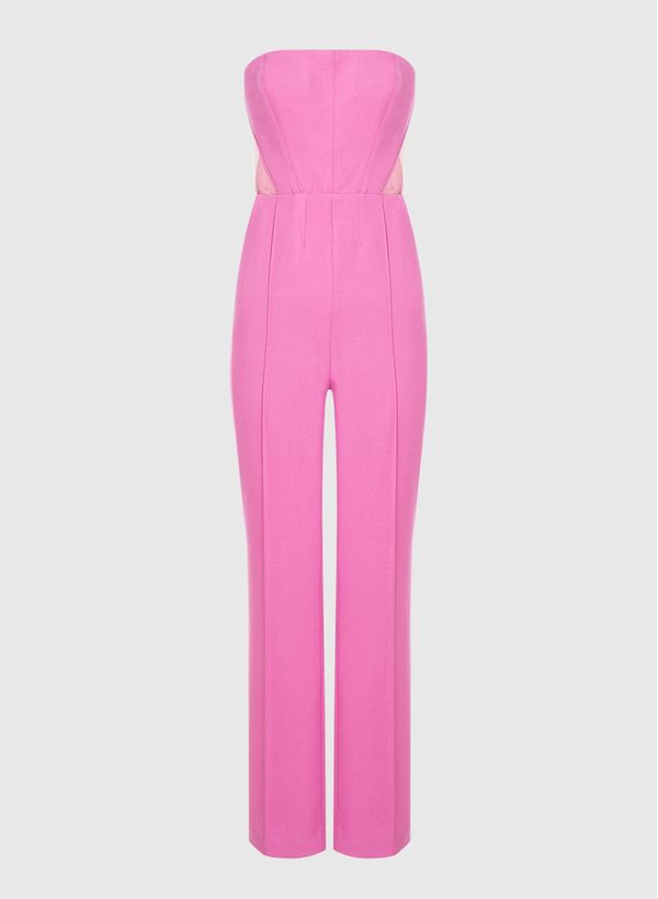 Confeccionado em tecido plano, o Macacão possui modelagem de alfaiataria, caimento acinturado, modelo sem alças, recortes com tule nas laterais, detalhe de pences frontais, dois bolsos frontais no modelo faca, dois bolsos embutidos posteriores, fechamento posterior por zíper, aplicação posterior exclusiva do logo da marca, comprimento longo e acabamento pespontado.