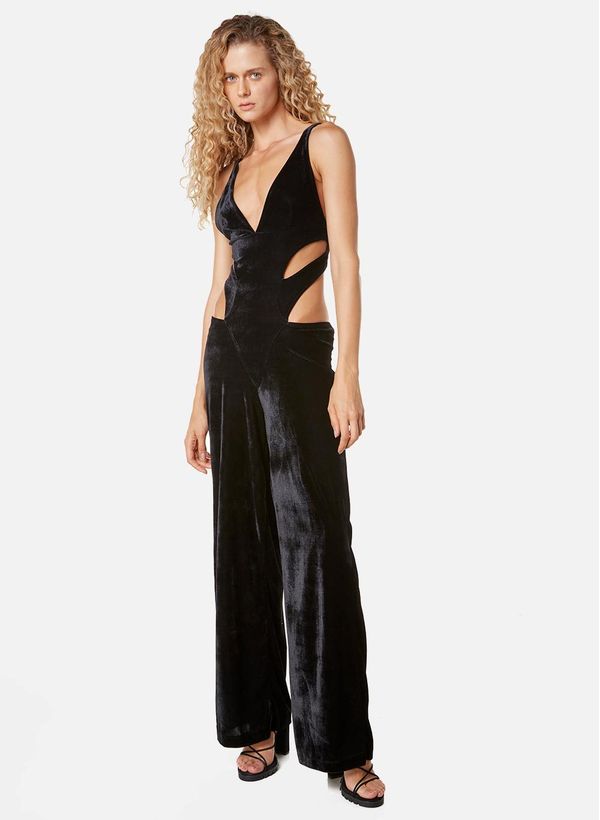 Confeccionado em veludo, o Macacão possui modelagem ampla, decote em “V”, recortes laterais na cintura e alças de média espessura com regulador.
