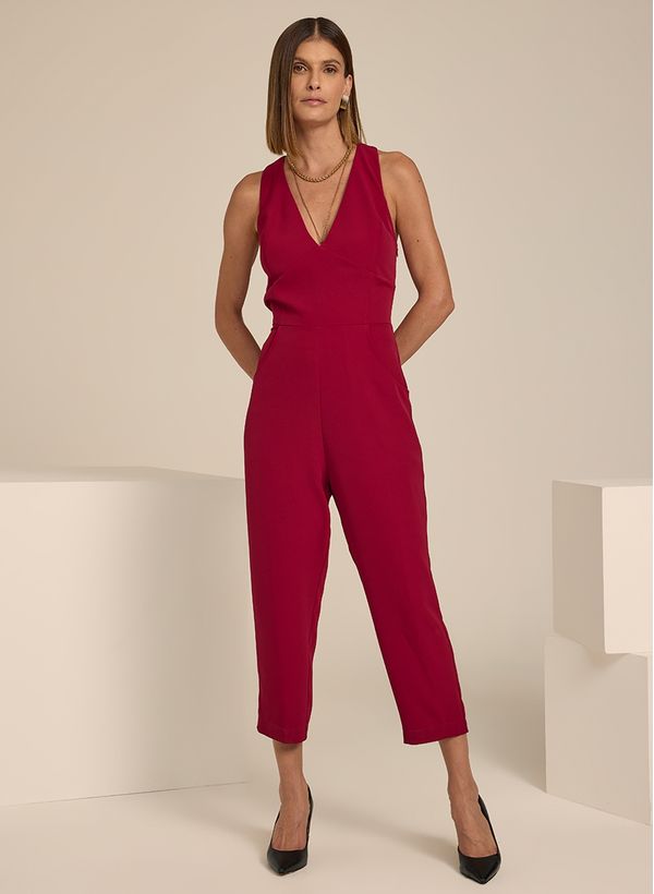 O Macacão é confeccionado em crepe, possui decote V, alças médias, bolsos frontais e posteriores, argola aplicada, fechamento lateral por zíper invisível, comprimento longo e acabamento pespontado.