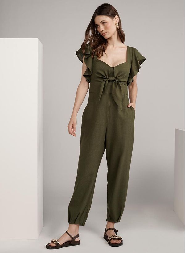 O Macacão é confeccionado em tecido plano, possui decote coração com detalhe de laço frontal, mangas curtas com babados, posterior com lastex aplicado e fechamento por zíper invisível, bolsos frontais e posteriores, barras com pregas e abertura lateral por zíper.