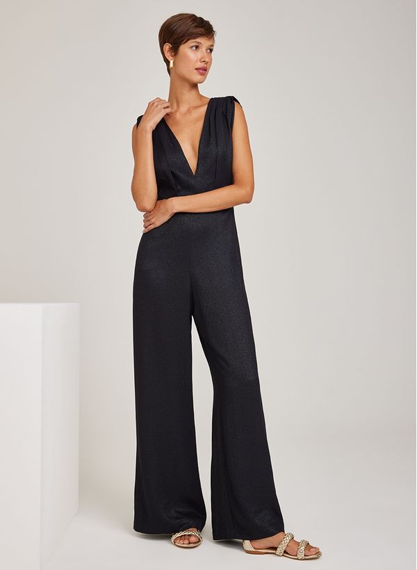 O Macacão é confeccionado em tecido plano com efeito metalizado, possui caimento reto, decote V, alças largas, detalhe vazado posterior, amarração posterior e acabamento pespontado.