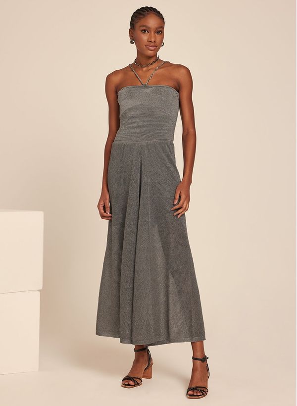 O Macacão é confeccionado em tricot, possui decote frente única, alça fina, fechamento lateral por zíper invisível, comprimento longo e acabamento canelado.