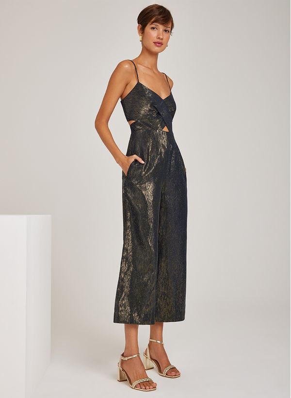 O Macacão é confeccionado tecido plano com efeito metalizado, possui modelagem alfaiataria, caimento reto, decote V, alças finas, detalhes transpassado com vazados, bolsos frontais, bolso posteriores embutidos, fechamento posterior por botões e zíper invisível.