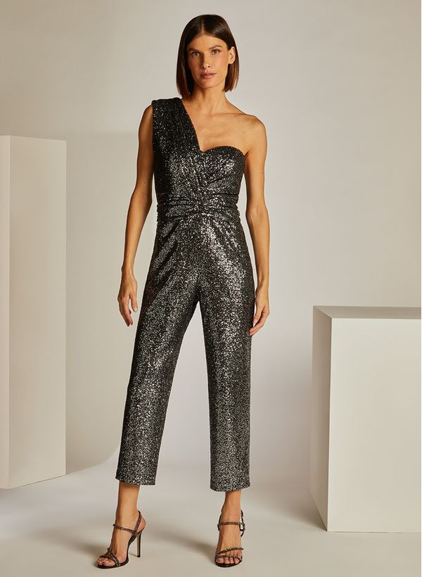 Confeccionado em tecido fluido, o Macacão possui bordados por paetê, caimento acinturado, decote assimétrico com apenas uma alça plissada, cintura com detalhes drapeados e acabamento pespontado.