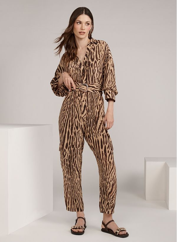 O Macacão é confeccionado em seda com estampa de leopardo, possui gola com colarinho, decote V, pregas frontais, mangas 3/4 com volume bufante, bolsos frontais e laterais com lapelas, fechamento frontal por botões com vista sobreposta. Peça acompanha faixa de mesmo tecido com regulagem por fivela.
