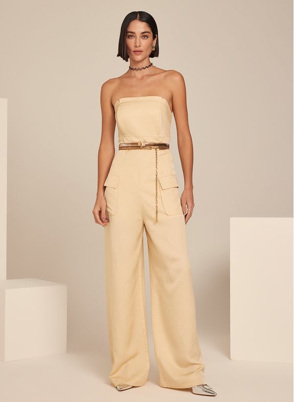 O Macacão é confeccionado em tecido plano com toque de linho, possui modelagem alfaiataria, modelo off shoulder, bolsos frontais com lapelas, faixa para amarração, fechamento posterior por zíper invisível, comprimento longo e acabamento pespontado. A peça acompanha faixa para amarração.
