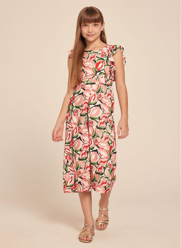 O Macacão é confeccionado em viscose, possui estampa, modelagem pantalona, decote reto, mangas curtas, babados aplicados, faixa para amarração, recorte vazado posterior, comprimento midi e acabamento pespontado.