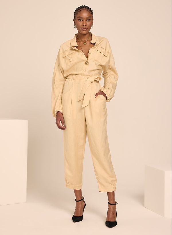 O Macacão é confeccionado em tecido plano com toque de linho, possui gola com colarinho, bolsos frontais com lapelas e posteriores, mangas longas bufantes, lastex aplicado com faixa, fechamento frontal por botões, comprimento longo e acabamento pespontado.