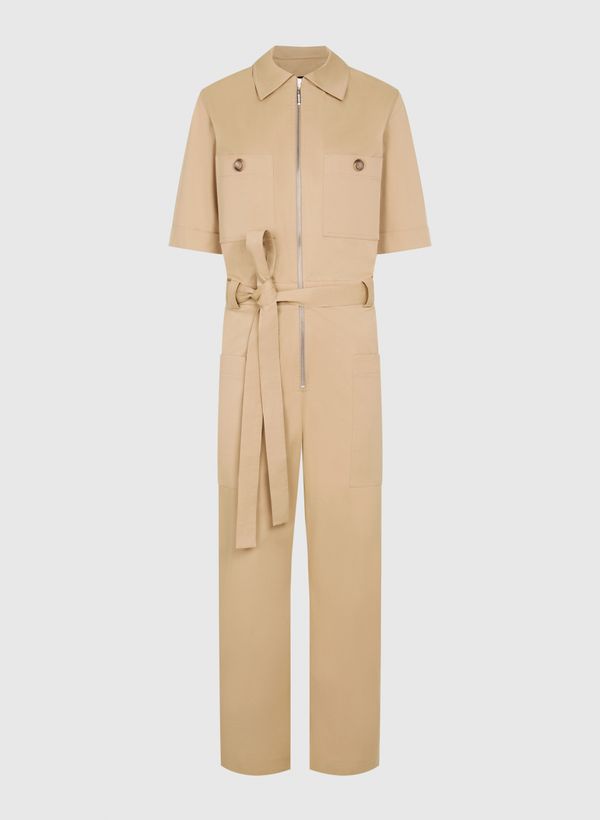O Macacão é confeccionado em alfaiataria estruturada feita em algodão, possui caimento reto, gola com colarinho, mangas curtas, dois bolsos com botões, dois bolsos tipo faca, dois bolsos posteriores com lapelas, passantes na cintura, fechamento frontal por zíper, comprimento longo e acabamento pespontado.