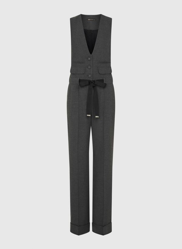 O Macacão é confeccionada em tecido de alfaiataria, possui caimento reto, cós com passantes, decote em "V", lapelas decorativas, dois bolsos frontais modelo faca, dois bolsos traseiros embutidos, fechamento frontal por botões, faixa de gorgurão para amarração, comprimento longo e acabamento pespontado.