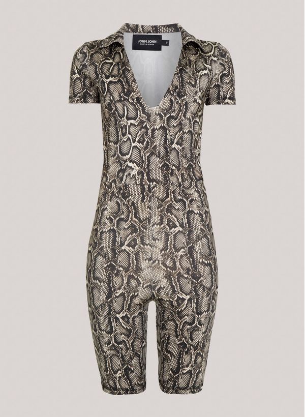 Confeccionado em malha estampada, o Macaquinho possui modelagem justa, decote em “V” com colarinho, mangas curtas e acabamento pespontado.