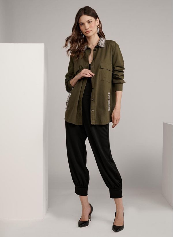A Parka é confeccionado em sarja, possui modelagem reta, colarinho com aplicações de pedrinhas, fechamento frontal por botões, mangas longas com abotoamento nos punhos, quatro bolsos frontais, barra arredonda e acabamento pespontado.