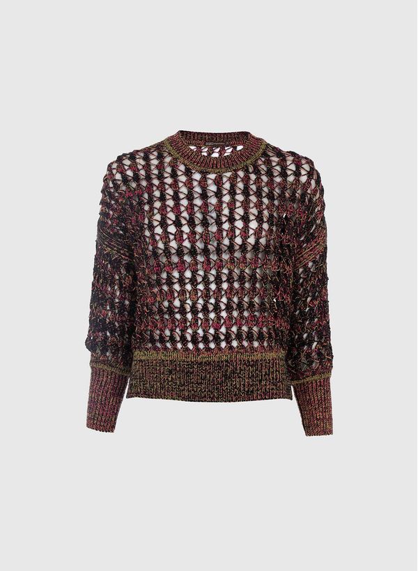 Confeccionada em tricô com vazados na trama, a Blusa possui modelagem ampla, mangas longas, gola redonda, comprimento curto, punhos e barra aplicados com acabamento canelado.