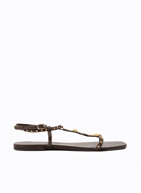 A Rasteira é confeccionada em couro, possui bico quadrado, tiras com aplicações met´licas, fechamento por fivela ajustável e sola flat.