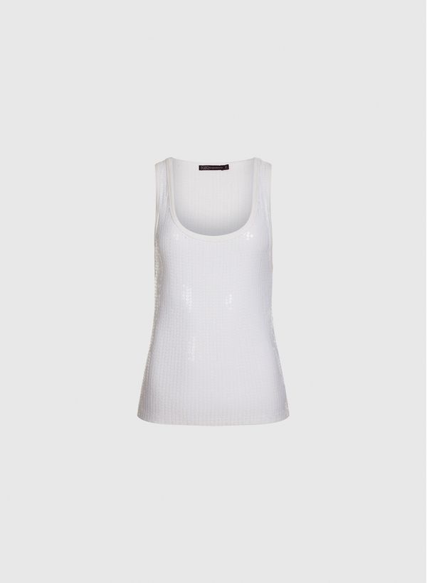 Confeccionada em malha, a Regata possui aplicações de paetês, caimento ajustado ao corpo, alças médias, decote em "U" e acabamento pespontado.