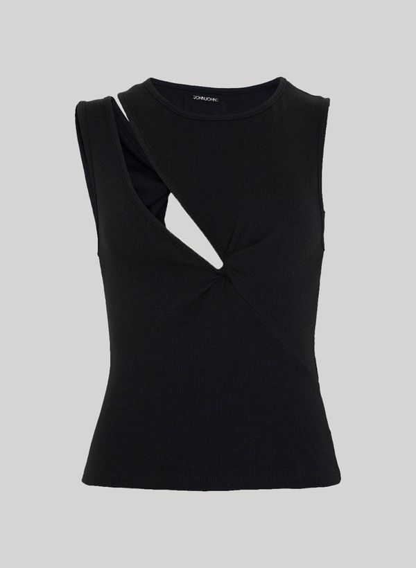 justa, decote arredondado, recorte frontal e posterior vazado com detalhes em ""nó"", cavas alongadas e acabamento pespontado.