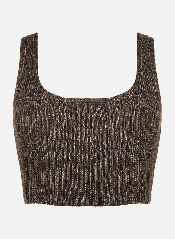 Confeccionada em tricot canelado com fios de lurex, a Regata possui modelagem justa, comprimento curto e corte básico, sem mangas, alça de largura média e decote levemente arredondado.