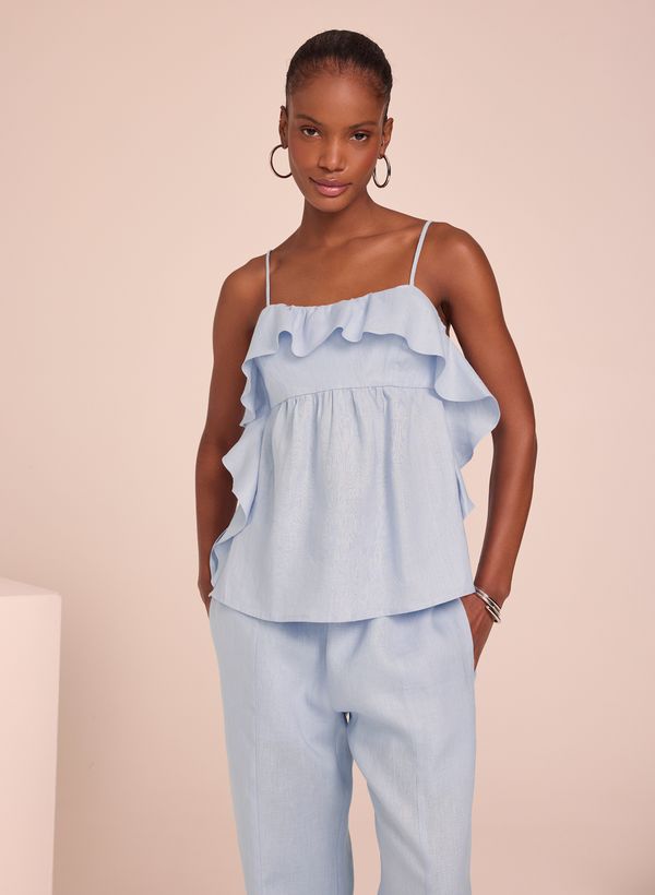 Confeccionada em linho, a Regata possiu caimento mais solto ao corpo, decote levemente arredondado, alças finas, detalhes de babados frontais e acabamento pespontado.