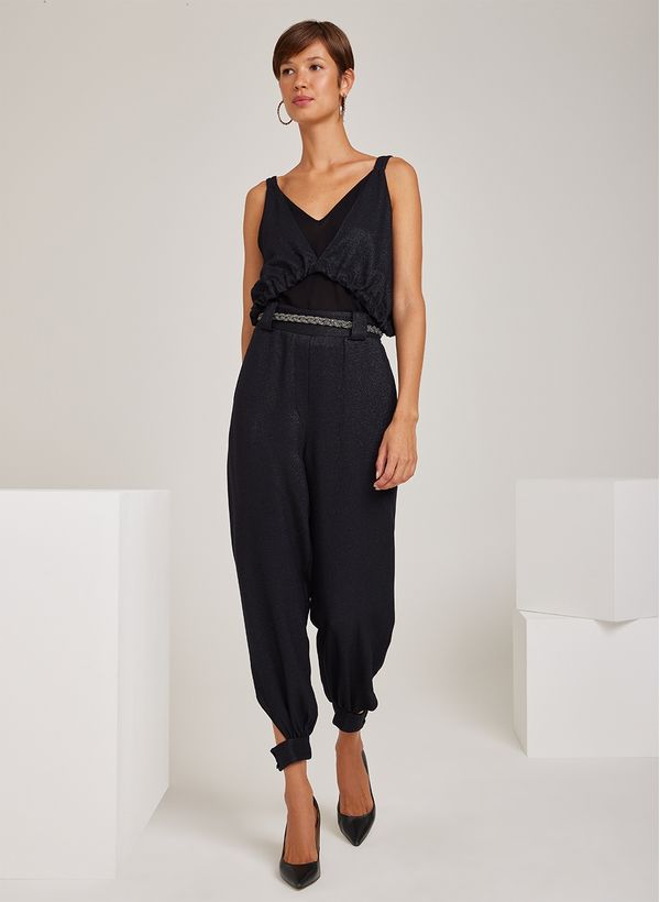 A Regata é confeccionada em crepe, possui transparência, alças médias e decote V. Possui top sobreposto com fios metalizados, decote V e barra com cordão para amarração posterior.