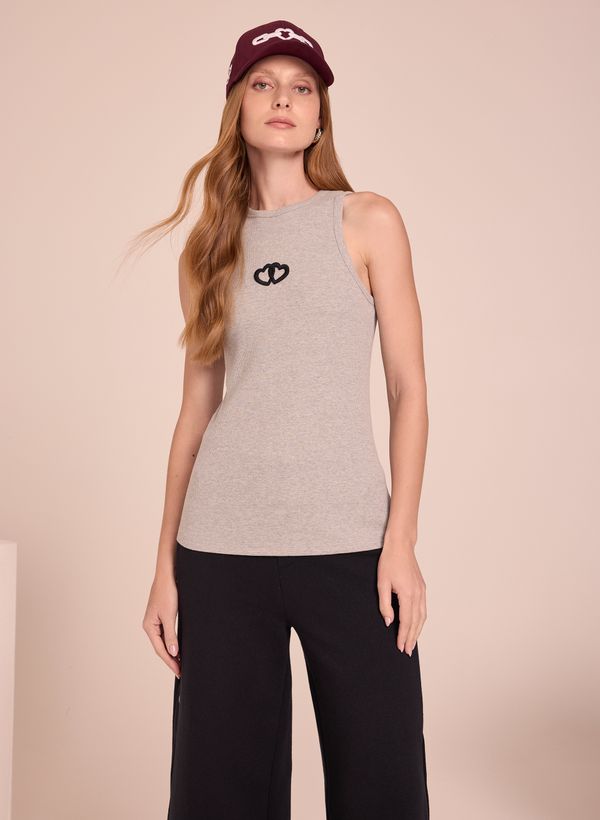 A Regata é confeccionada em malha, possui modelagem justa ao corpo, detalhe bordado frontal de corações, gola redonda, alças médias e acabamento pespontado.