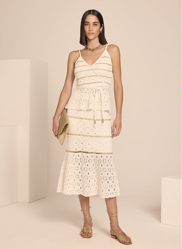 A Regata é confeccionada em tricot com mini vazados, possui decote "V" transpassado, alças finas e acabamento canelado.