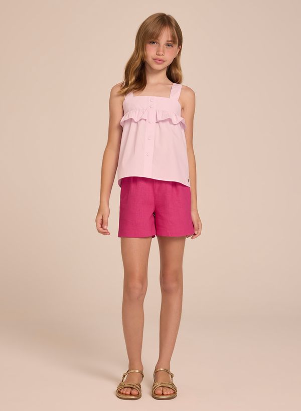 A Regata é confeccionada em malha, possuidecote reto, alças médias, botões e babado aplicados, e acabamento pespontado.